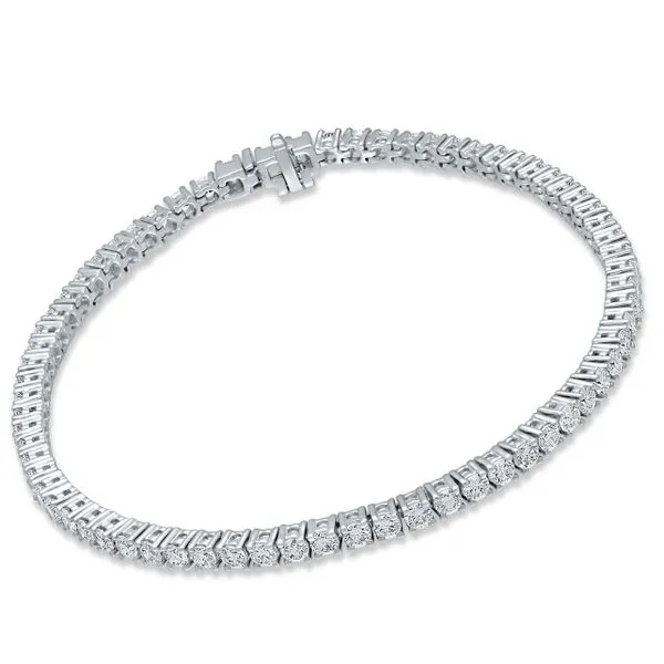 A single row of sparkling brilliant cut diamonds is set in beautiful shared 14kt white gold four prong settings in this sparkling lab diamond tennis bracelet with a total weight of approx 3 carats. The sturdy lock hugs your wrist gently while dazzling diamonds flow and sparkle flexibly with every mo...more ve.